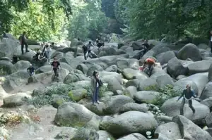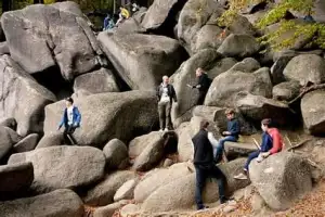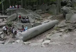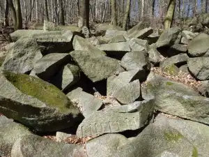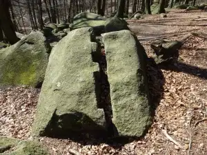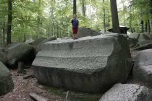 Der „Stein­beißer“ war im Vorteil, er hatte mehr Wurf­ma­terial. So kam es, dass „Fels­hocker“ bald unter den Blöcken begraben wurde; angeblich hört man ihn noch gele­gentlich dar­unter brüllen. Die Felswand des Hohen­stein soll die letzte Haus­mauer des anderen Riesen sein. So wurde im Volksmund die Ent­stehung des Fel­sen­meeres erklärt.