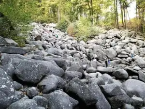 Das Fel­senmeer auf dem Felsberg oberhalb von Lau­tertal-Rei­chenbach im Vor­deren Odenwald ist eine Fel­sen­land­schaft aus dun­kel­grauem Quarz­diorit (genauer ein Horn­blende-Biotit-Diorit), die durch Woll­sack­ver­wit­terung entstand.