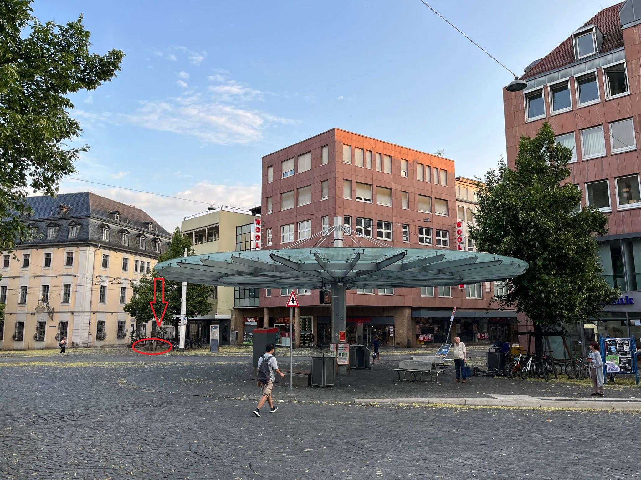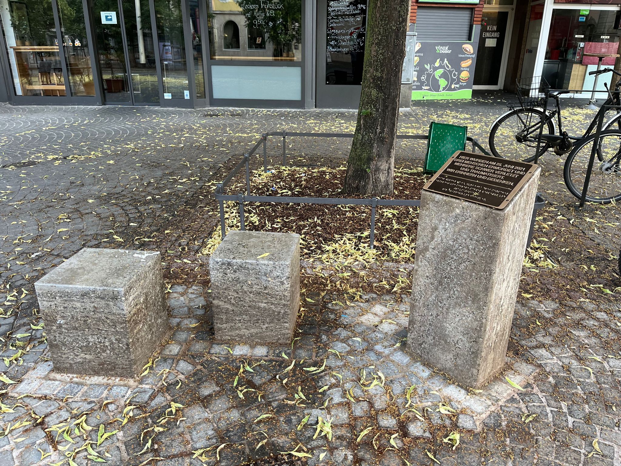 Wer sich dem Ort des Messermassakers nähert, der wird höchstens durch Zufall das unscheinbare, mehr lieblos als mit Überzeugung und Mitgefühl produzierte Mahnmal, das man zwischen einem Fahrradabstellplatz und einer Dönerbude aufgestellt hat, entdecken.