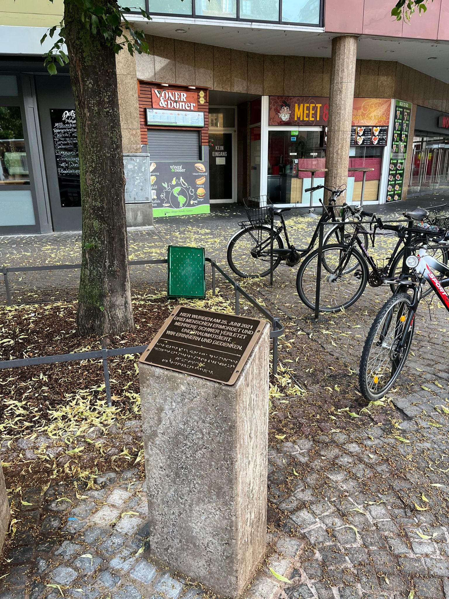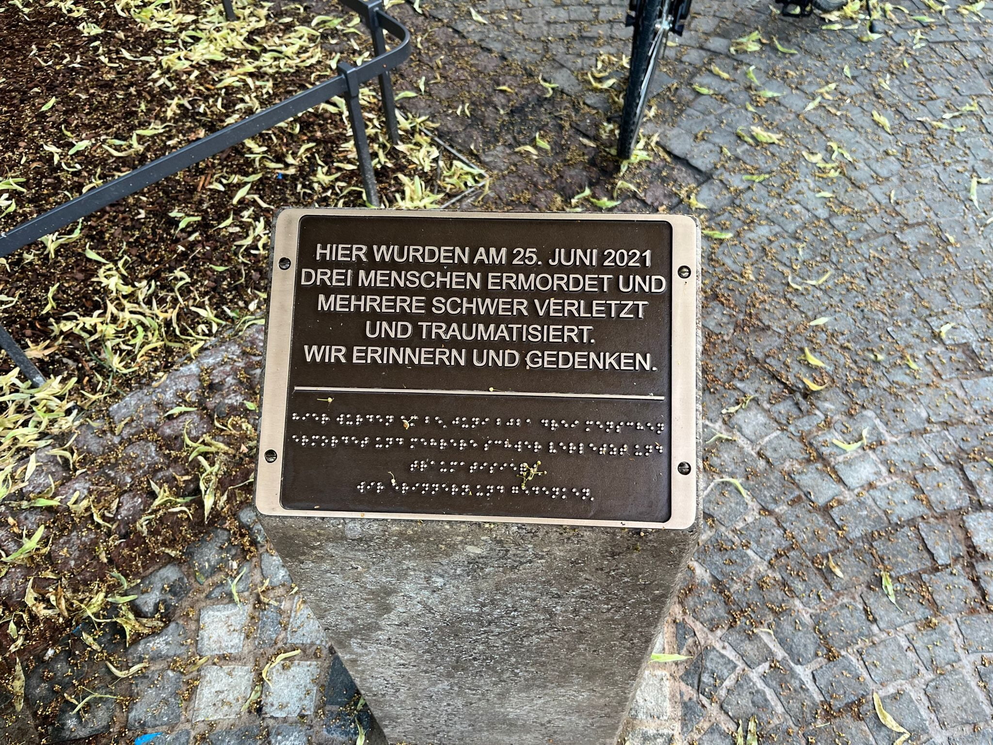 Wer nicht weiß, welcher Terror sich hier am 25. Juni 2021 abgespielt hat, der wird durch die Gedenktafel auch kaum schlauer: „Hier wurden am 25. Juni 2021 drei Menschen ermordet und mehrere schwer verletzt und traumatisiert. Wir erinnern und gedenken.“ – so der Text.
